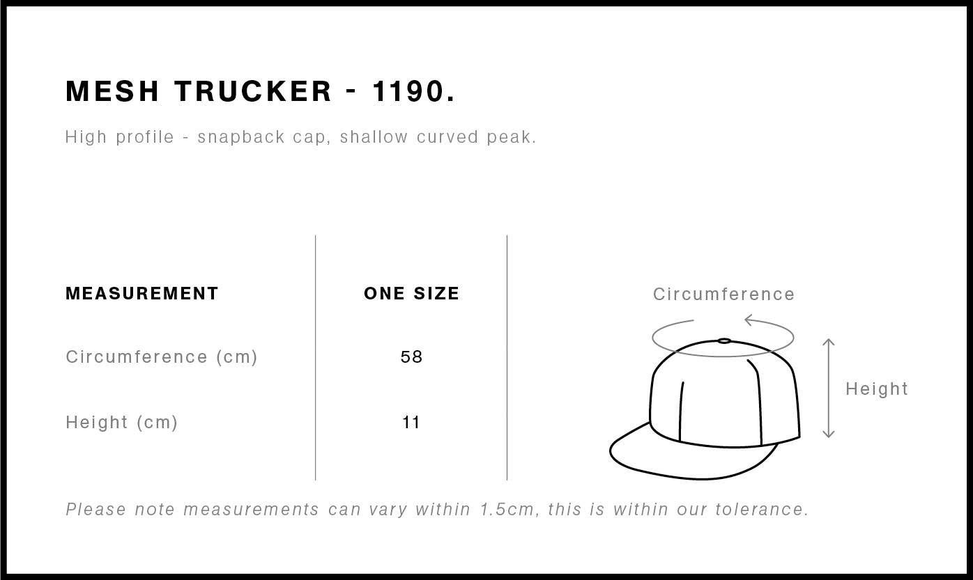 Construction : Snapback cap, shallow curved peak, tonal mesh back, plastic snapback, tonal under-peak lining